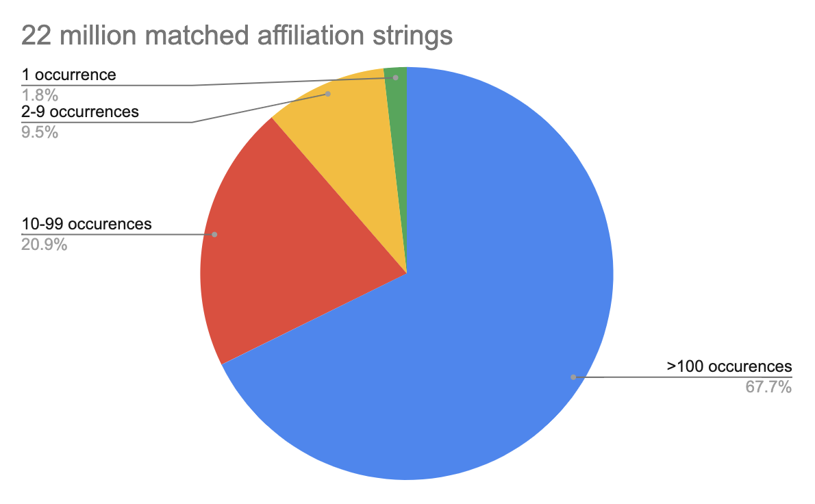 However, we’re getting close to the limit of what we can do with human classification without lots of effort. Our most recent pass through our metadata has just over 4.8 million unique unclassified strings yielding a total of 16.6 million unclassified affiliations. There are about 6000 unclassified affiliations that appear 100 times or more in the metadata and assigning them aff_ids would provide a lot of new information. However, over 65 percent of unclassified affiliations occur fewer than 10 times, and 13 percent of unmatched affiliation strings only appear once in all of our affiliation metadata.