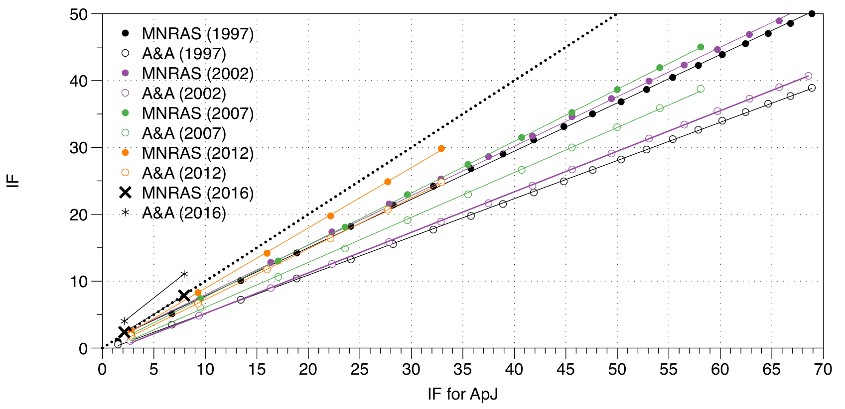 This IF is another way of quantifying relative aging of citations, or relative use of articles. The diagram below shows a comparison between MNRAS, A&A, and the ApJ (main journal). The dotted line represents equal IF between the ApJ and a given journal. Qualitatively IF ratios grow linearly for the journals in our comparison below (R2=0.9996). However, quantitatively speaking, the MNRAS values of IF are about 0.72 of those for the ApJ for publications from 1997. In the case of A&A articles published in 1997, the IF values are 0.57 of those for the ApJ. In addition to articles published in 1997 (black points), the diagram compares IF values for articles published in 2002 (purple points), 2007 (green points), and 2012 (orange points). For each journal and publication year, a line has been fit to the data, as shown. For 2002 the slope for MNRAS increased to 0.74 and for A&A to 0.61. Again 5 years later, we only see a significant increase for A&A, but the size of the ApJ is still significantly larger. This illustrates the dominance of the ApJ in the field. These shifts in time are due to multiple factors that will be hard to single out. For one, editorial policies change over time. We also know that citation behavior changes over time (see e.g. Henneken et al. 2009, figure 2). We do see the effect we mentioned in the previous blog, of MNRAS catching up with the ApJ. This is illustrated by the data for 2016.