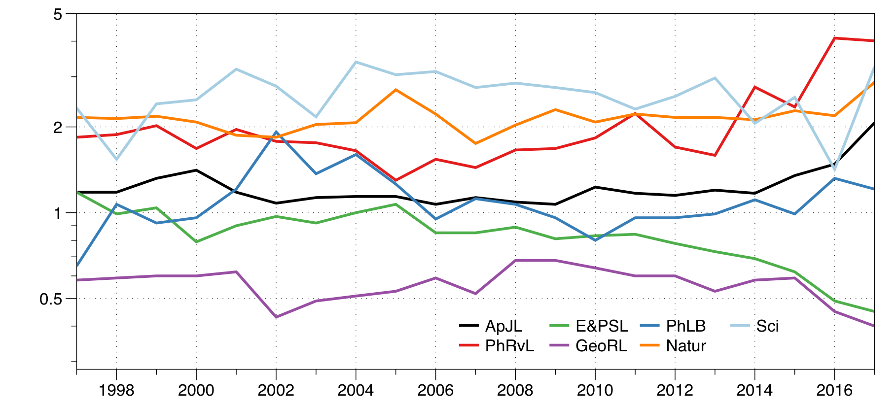 The relatively steep rise for PhRvL is largely due to gravitational wave publications, especially the LIGO papers, just like how the Planck papers skew the results for A&A (see diagram below). Values for 2017, and probably even 2016, should be interpreted with some caution, because these publications are still actively accumulating significant citations. It is also worth noting that a journal like E&PSL is very much embedded in the Earth Sciences discipline, which has very different citation rates.