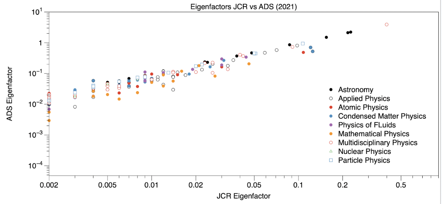 Next, we compare journal ranking using Eigenfactor values. In other words, if we create a ranked list of journals, how does, say, the top 100 compare with one based on JCR values? In the end, this is what we are looking for. The actual Eigenfactor values are not relevant, since we are only interested in relative values. It is the ranked list that will provide us with the candidates for the Core Collection. We generated and compared the top 100 for the period 2010 thru 2021. For the first decade the top 100 lists are identical; for 2020 and 2021 they only differ in the very tail. For 2020 the ADS list contains the Bulgarian Astronomical Journal (bibstem BlgAJ), where the JCR has Astrophysics (bibstem Ap). For 2021 the ADS list contains Contributions of the Astronomical Observatory Skalnate Pleso (bibstem CoSka), where the JCR has again Astrophysics (bibstem Ap). For both journals, present in the ADS list, Web of Science is highly incomplete.
