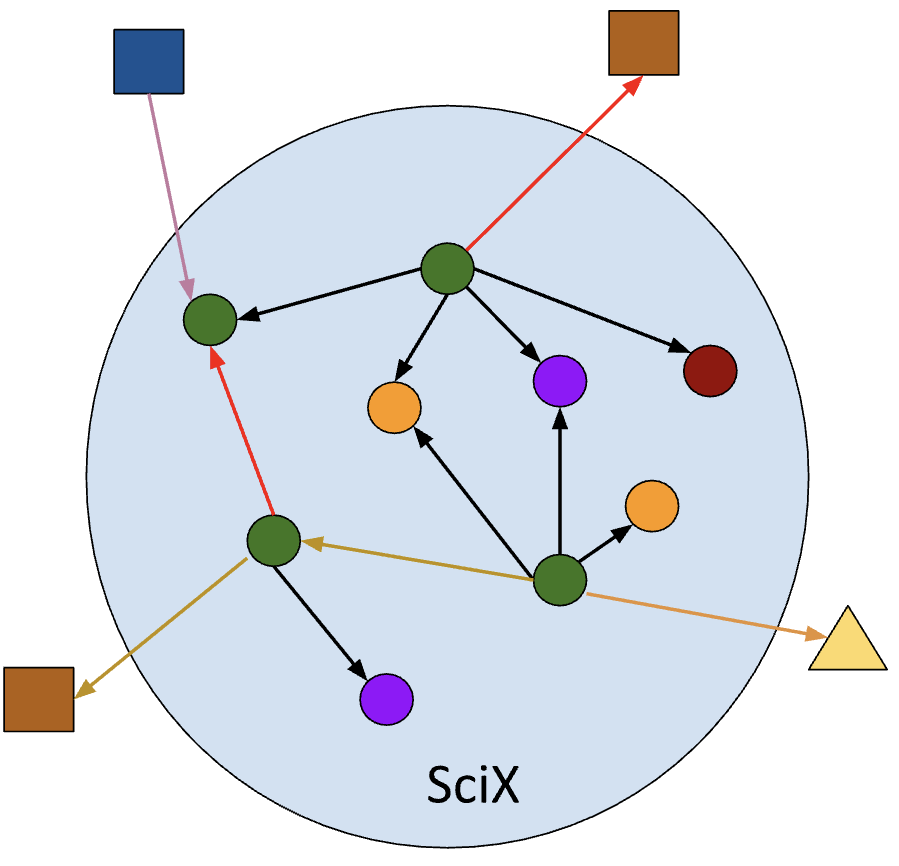 Figure 1. The SciX holdings represented as a graph. The different shapes represent different resources (articles, data, software) and the different colored arrows represent relationships (like cites, supplements,...). Some of these links, like "record A cites record B" (e.g. the black arrows) only have meaning within SciX, because it is a relationship between two entities that only exist within SciX.
