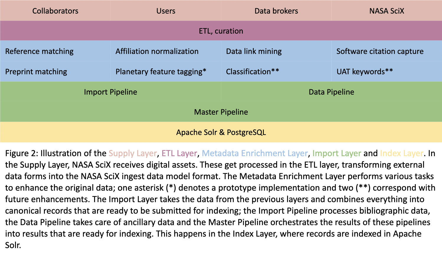 The augmentation layer enriches the original data with all kinds of information. In addition to making publications discoverable, SciX also maintains a citation graph. This graph is the result of the reference matching software in the augmentation layer; this framework takes reference data, either supplied or extracted, and attempts to match these to existing SciX records. The affiliation pipeline normalizes affiliations into canonical formats (see this blog). The mining of data links will be discussed in part II of this series. The software citation capture was discussed in this blog. The preprint matching process (called “docmatching”) is highlighted in this blog. We are developing a process that tags publications with planetary feature names, taken from the USGS Gazetteer of Planetary Nomenclature (see this publication). Future augmentations will include a pipeline that will assign publications to one of the disciplines represented in SciX (document classifier) and a pipeline that will assign terms from the Unified Astronomy Thesaurus (UAT tagger), whenever possible.