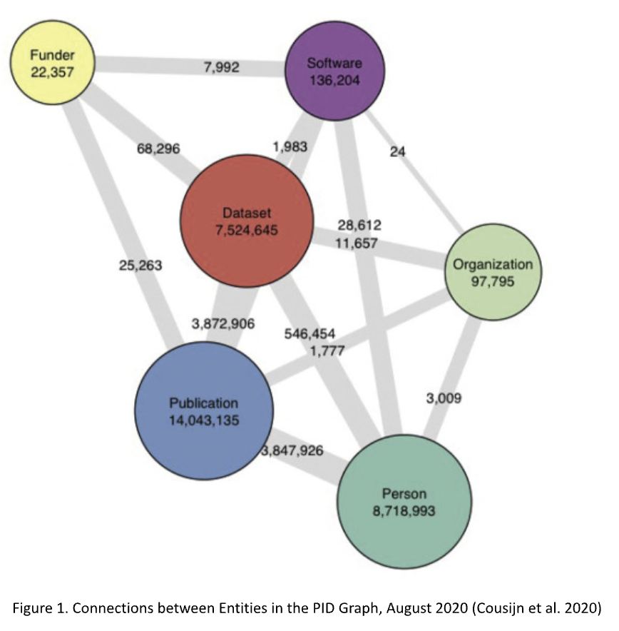 This blog is the final part in the series on data linking and indexing in the Science Explorer (SciX). In the first part we provided a general overview of the holdings in SciX, and the second part discussed the role and merits of linked data in this service. In this part we do something similar for cited data products. There is no fundamental difference between articles citing other articles (something which we have been recording for decades) and articles citing data; actually, the “cites” relationship can be between any bibliographic asset. Citations are just one small subset of the entire graph of linkages between research assets; if we add the constraint that all these research assets must have a persistent identifier (PID), this graph is also referred to as the PID graph. A citation graph is a special case of a PID graph. Figure 1 illustrates the PID graph as generated by project FREYA in August 2020 (Cousijn et al. 2020).
