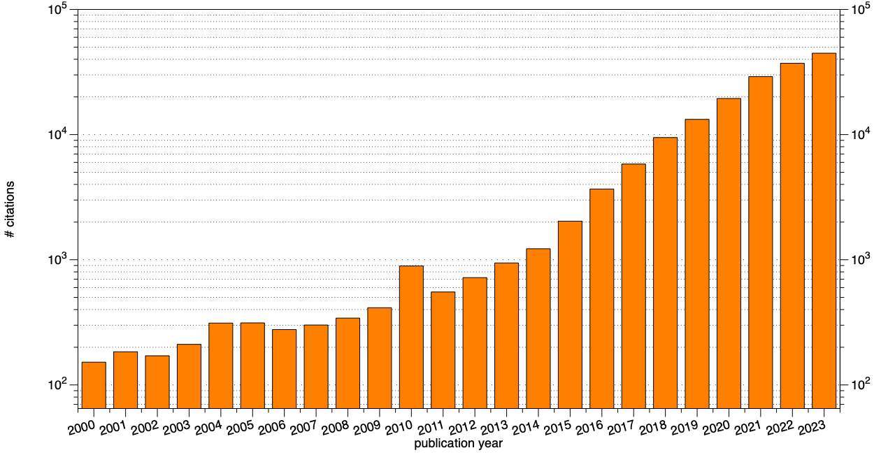 Besides these high-level data products there is a very long tail of custom data products; they are mostly those that were made to support a particular publication. Some data centers support the creation of data bundles based on the selection of parts of larger datasets, often supporting the creation of a DOI for this custom bundle. Creating records for these as they get cited would result in opening the floodgates for indexed data products in SciX. Clearly, that would not be a desirable outcome. This is the part where we need to nuance the indexing criterion. This nuance will come in the form of a “reuse criterion”: only when a data product is cited a second time will a record be created. Figure 2 gives an indication of what to expect: it shows the citation count as a function of publication year for dataset records in NASA SciX. These are not the actual counts, currently in the system, but the estimated ones if we were to create a record for every cited DOI corresponding to a dataset. The actual counts are likely to be even higher.