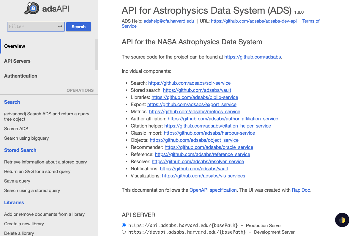 However, while our existing API documentation covered the most widely used features, such as searching ADS and using libraries, there were a number of useful features that we’ve never documented for our user base. And that doesn’t even touch all of the new features we’ve added over the last few years! Instead of updating our existing docs in a piecemeal manner, we decided to document our full API using the OpenAPI specification1.