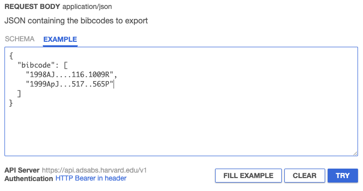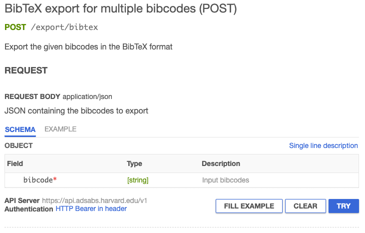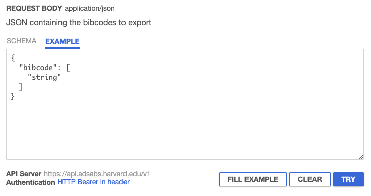 This works similarly for operations that have the POST HTTP request method, but there is a slight difference. Let’s look at one more example. The BibTeX export for multiple bibcodes uses the POST method. You can see that while this operation doesn’t have any parameters (though some POST operations do), it does have a request body, which is used to pass in the bibcodes you want to export. The default view for a request body is the “schema” tab, which shows the information you can pass in via the body (again, the fields marked with an asterisk are required).