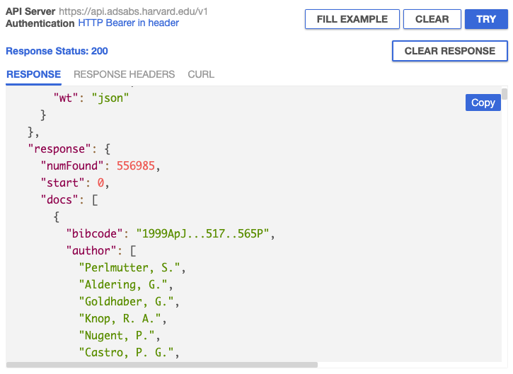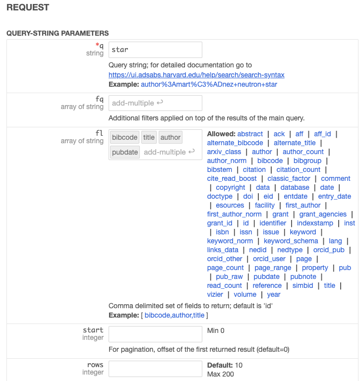 Scroll past the description and examples to the Request section. Here, you’ll find a list of required (marked with an asterisk) and optional parameters, each with a short helpful description. For this operation, the only required parameter is the “q” parameter; enter your search terms here. In this example, shown below, we’re searching for papers containing the word “star.” There are also some optional parameters available; here, we’re using the “fl” parameters to specify that we want the bibcode, title, author, and publication date returned for each search result.