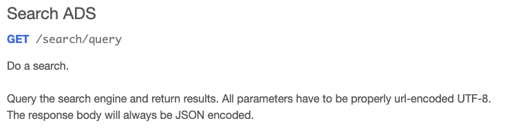 We’ll start with a basic search, using the operation labeled Search ADS. This operation uses the GET method and the endpoint /search/query. A longer description, with examples, is also provided in the documentation.