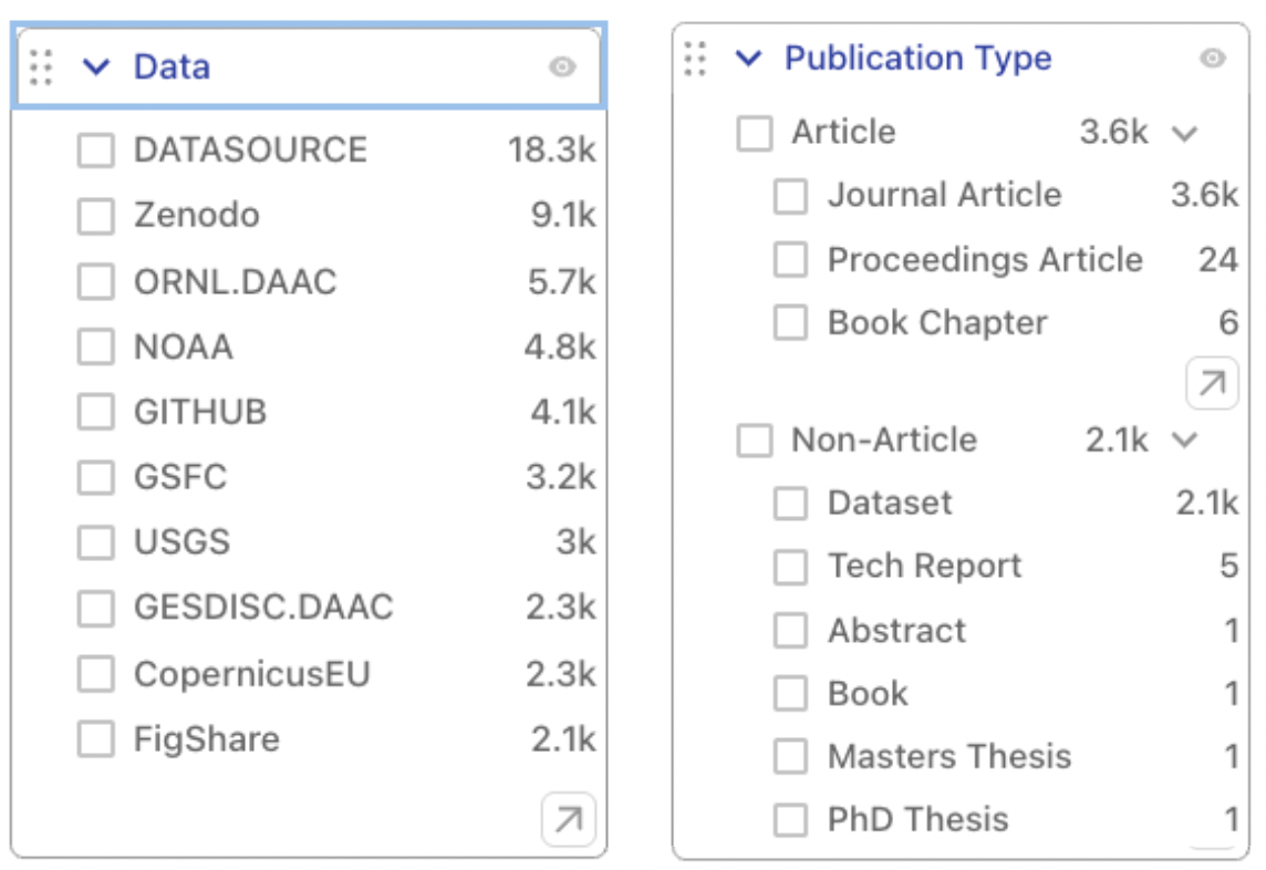As can be seen from the list of datasets displayed in the filter, data collections are sets of records labeled with the name of the repository that is hosting related data products. The list includes well-known disciplinary repositories such as the ORNL DAAC, NOAA, GSFC; general-purpose ones such as Zenodo, GITHUB, and Figshare; and a generic entry (“DATASOURCE”) used as a label for data hosted by repositories that don’t appear on our list of known archives.