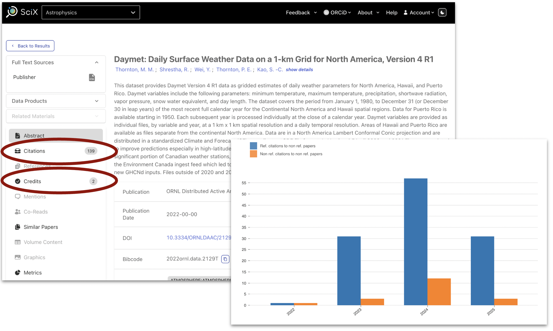 Figure 2: The SciX record for a dataset hosted by the ORNL DAAC. As of 8/25/2025, SciX has identified 139 citations and 2 credits from mentions for the dataset. Insert: the corresponding citation metrics for the record in question.