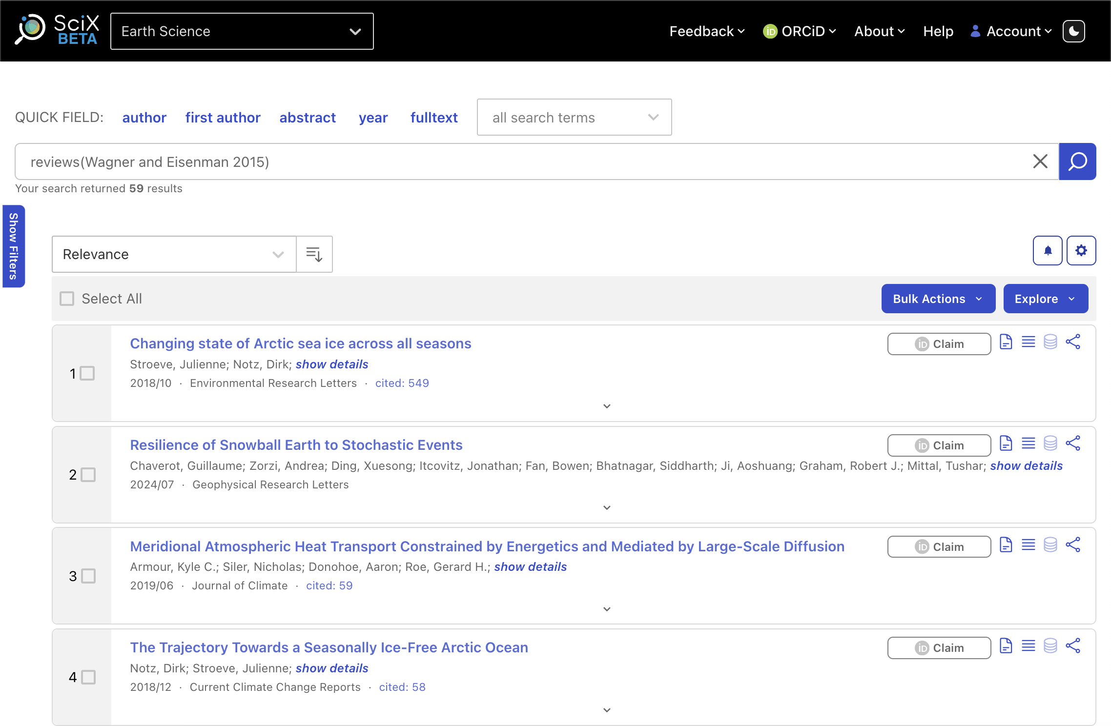 The abs:"" function of SciX can search my keywords in titles and also in the abstract and keywords sections. For example, I can type in the search bar on SciX abs:(“Antarctica” AND “snowfall” AND “sea ice”), and SciX will go through the titles, abstracts, and keywords of records in the corpus to find the most relevant literature for these topics.