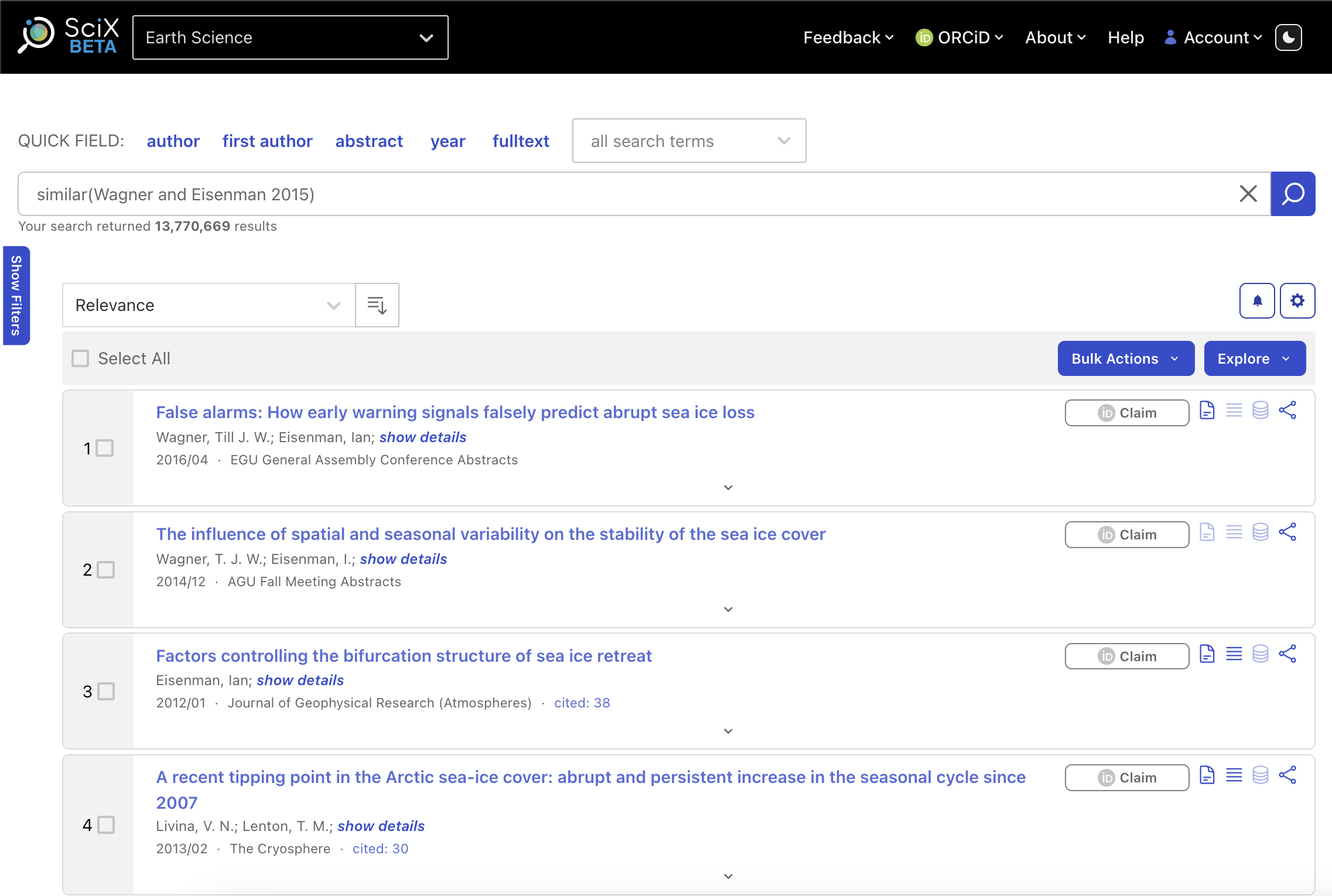 similar()helps me find papers that have similar content to this one paper I have. SciX compares abstracts and provides a robust way of discovering similar research when I have no idea who else is doing similar research in the field.