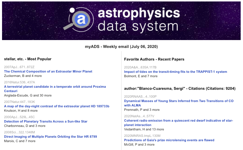 Nowadays, it’s challenging to keep up with astronomical research given that thousands of new papers are published every week and that the number of papers that are relevant to you is only a small portion of what is published. The myADS service delivers customized emails based on your notification preferences to help distinguish the relevant signal from the noise.
