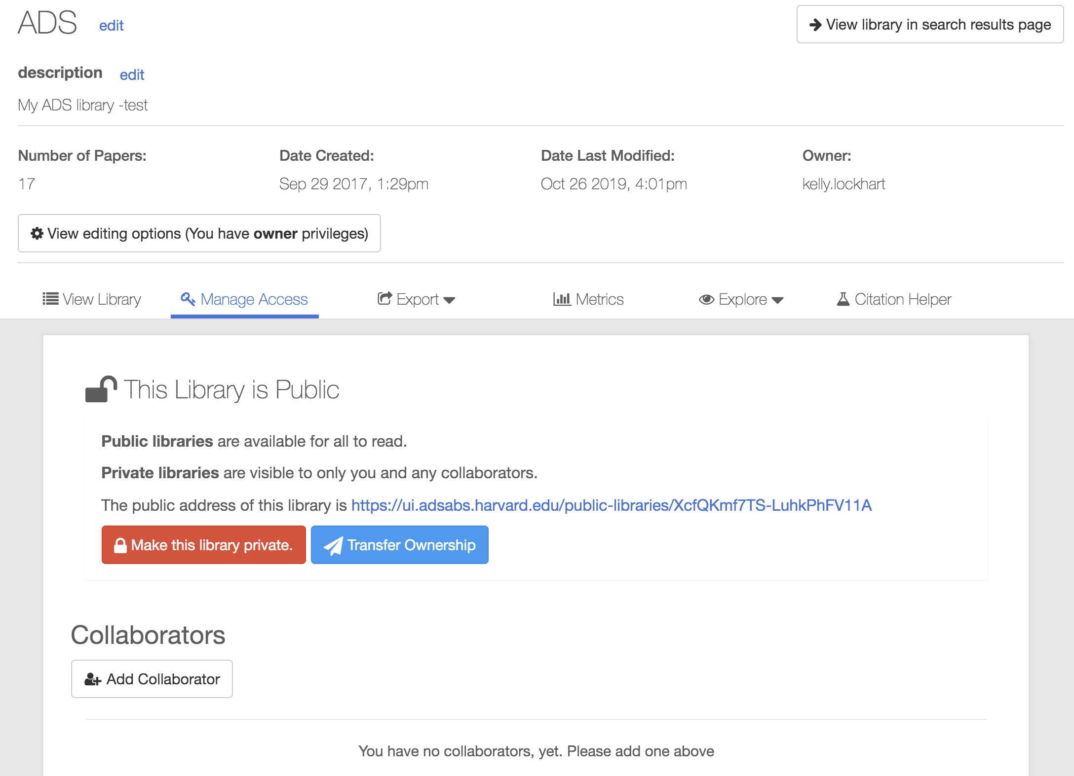 As noted above, libraries can only have one owner, so owner-level permissions cannot be assigned here. To transfer library ownership to another user, click the Transfer Ownership button, also on the Manage Collaborators tab, and fill out the email address of the new owner. As with collaborators, the new owner must already have an ADS account, and they will be emailed when ownership is transferred to them.
