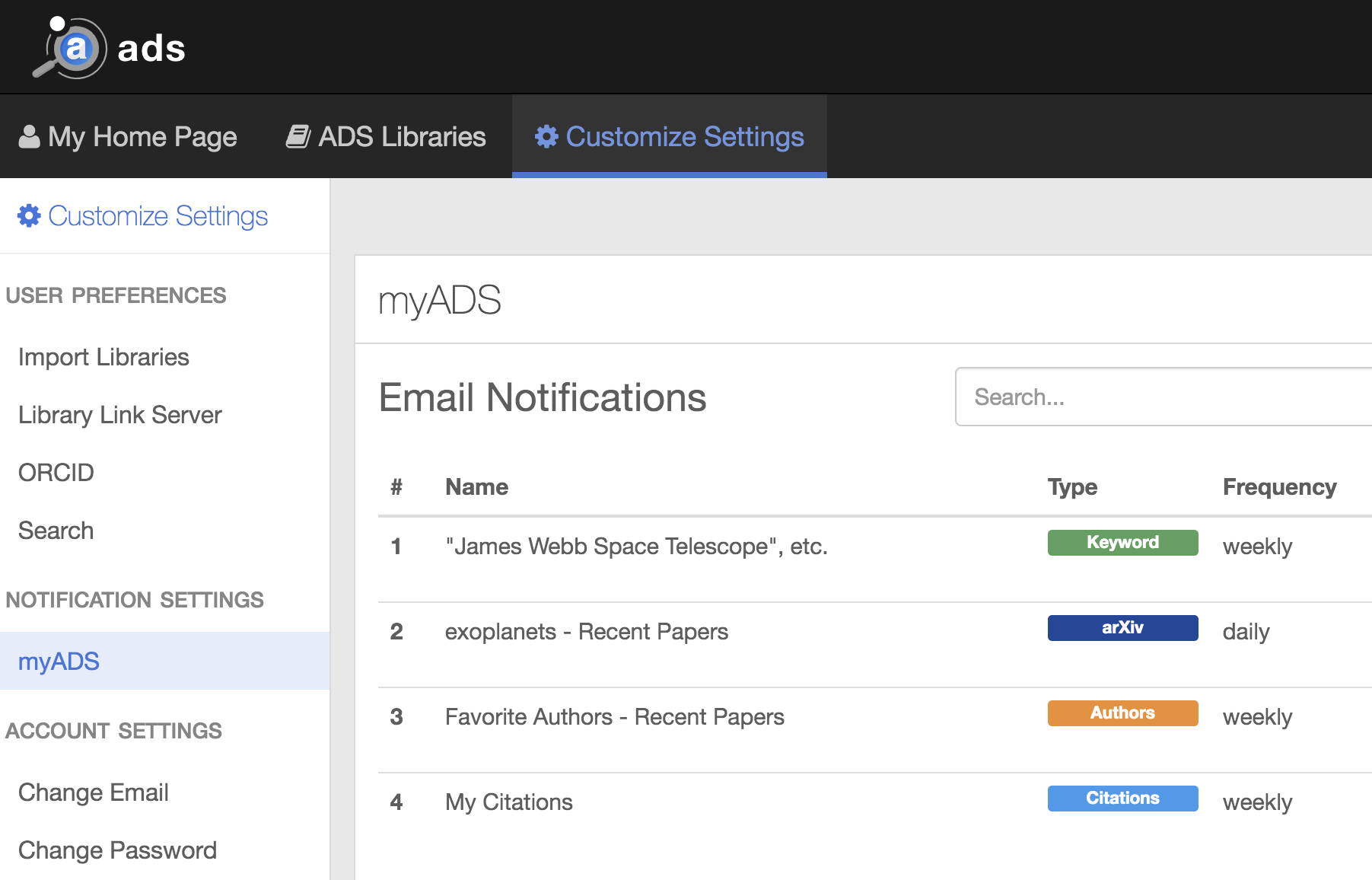A quick overview: emails are generated daily (on weekdays) and/or weekly (over the weekend). Daily emails let you know about new arXiv papers, while the weekly emails are geared towards notifications of newly published articles. If you used the Classic myADS, all of the notifications you had set up there have their counterparts in the new myADS, though there are some small differences. We’ve also added one additional notification type, designed to allow for more general notifications. Full documentation for the new myADS is available here.