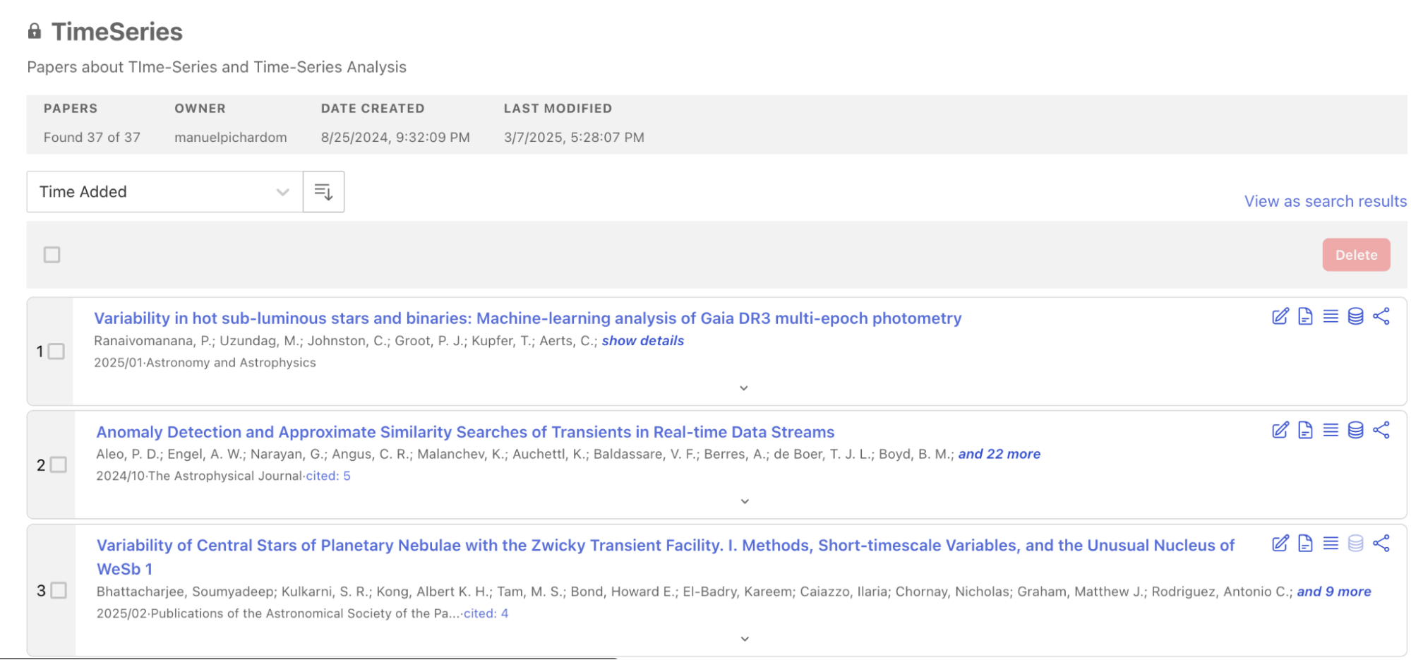 The “View as search results” option allows you to transform your library into a searchable query, enabling you to apply powerful second-order operators like similar, trending, useful, and reviews to your curated collection of papers.