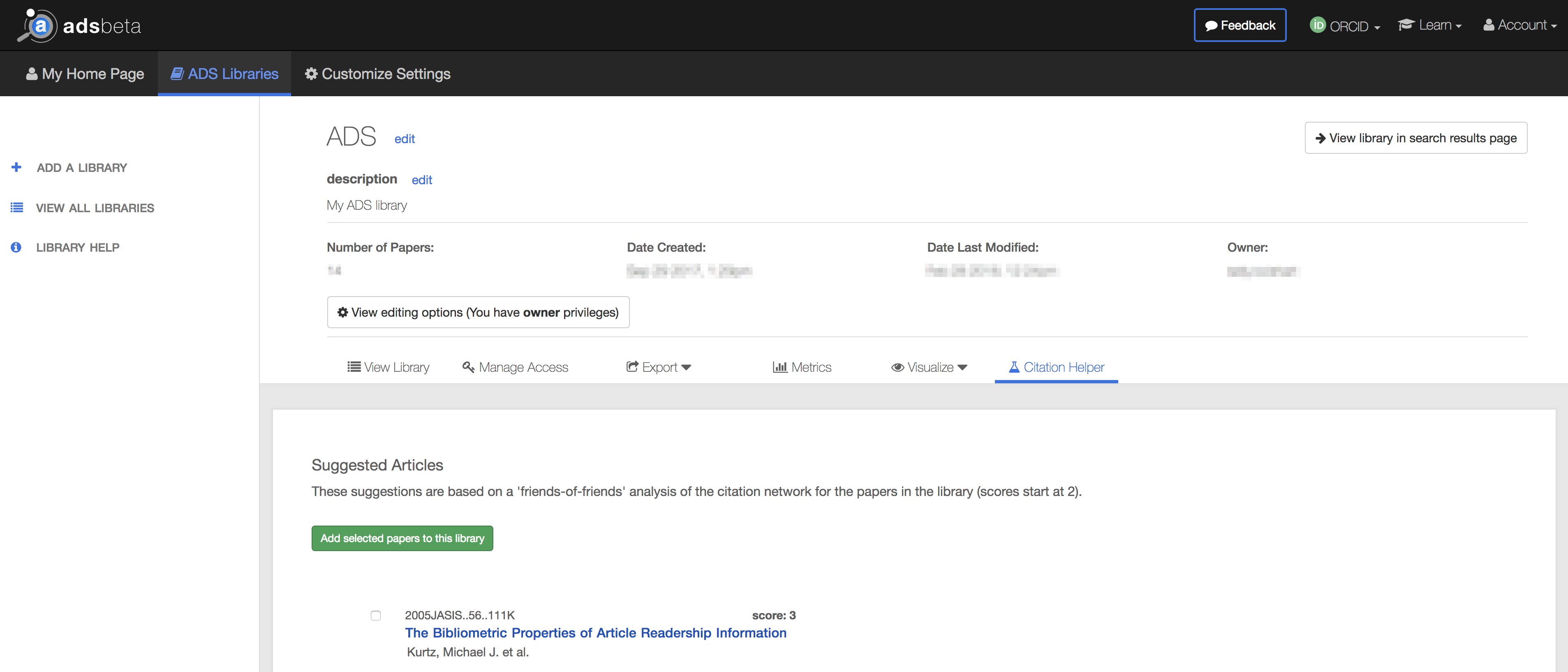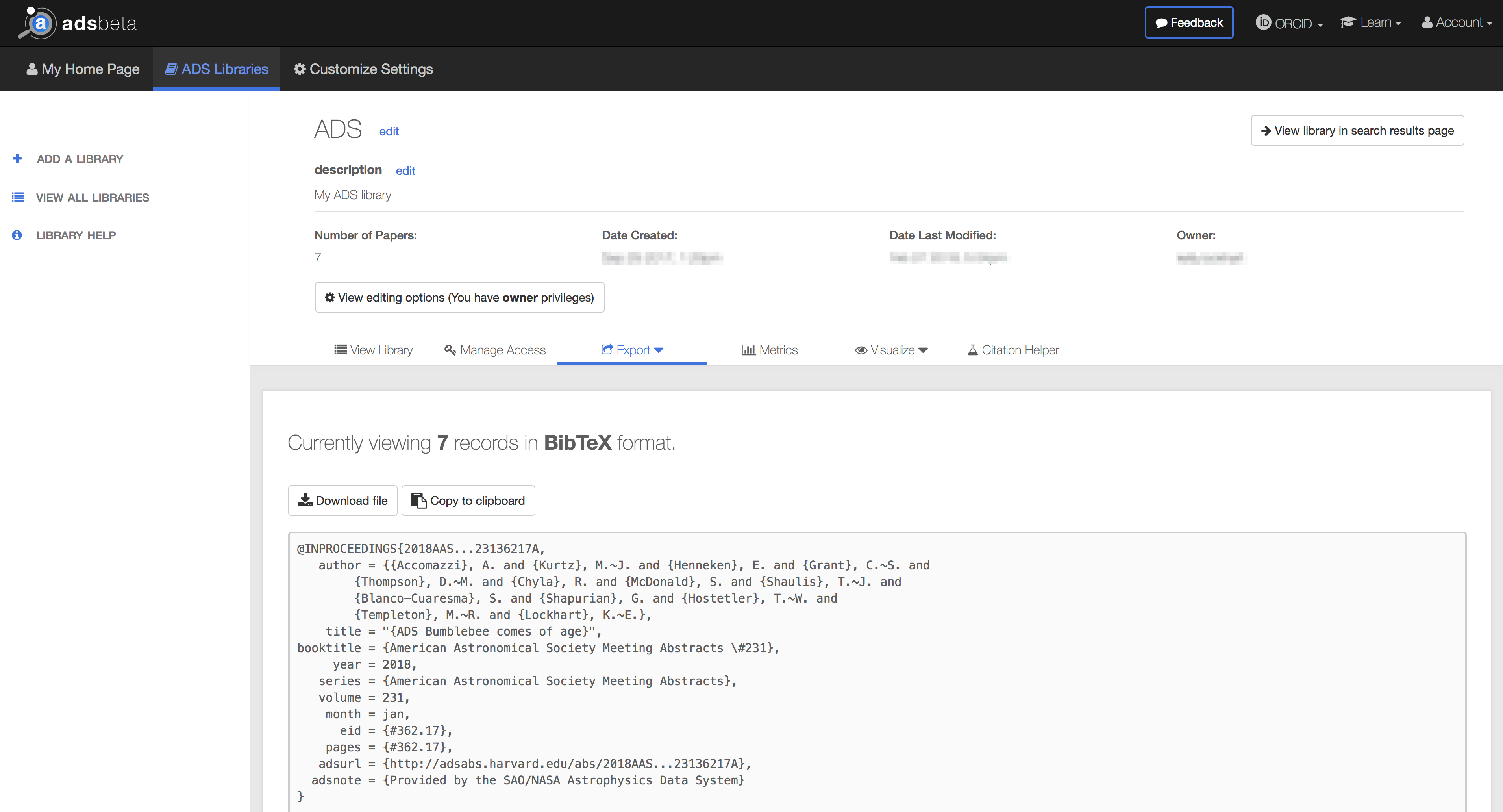 ADS libraries allow you to save collections of papers to view later. These libraries can be private (by default) or public. In addition to viewing and sorting saved papers, you can export the collection in a variety of formats, view citations and other metrics, explore visualizations such as the paper or author networks, and check for related papers. Libraries are a popular way to build reference lists when writing papers, or keeping one’s bibliography to use in a CV.