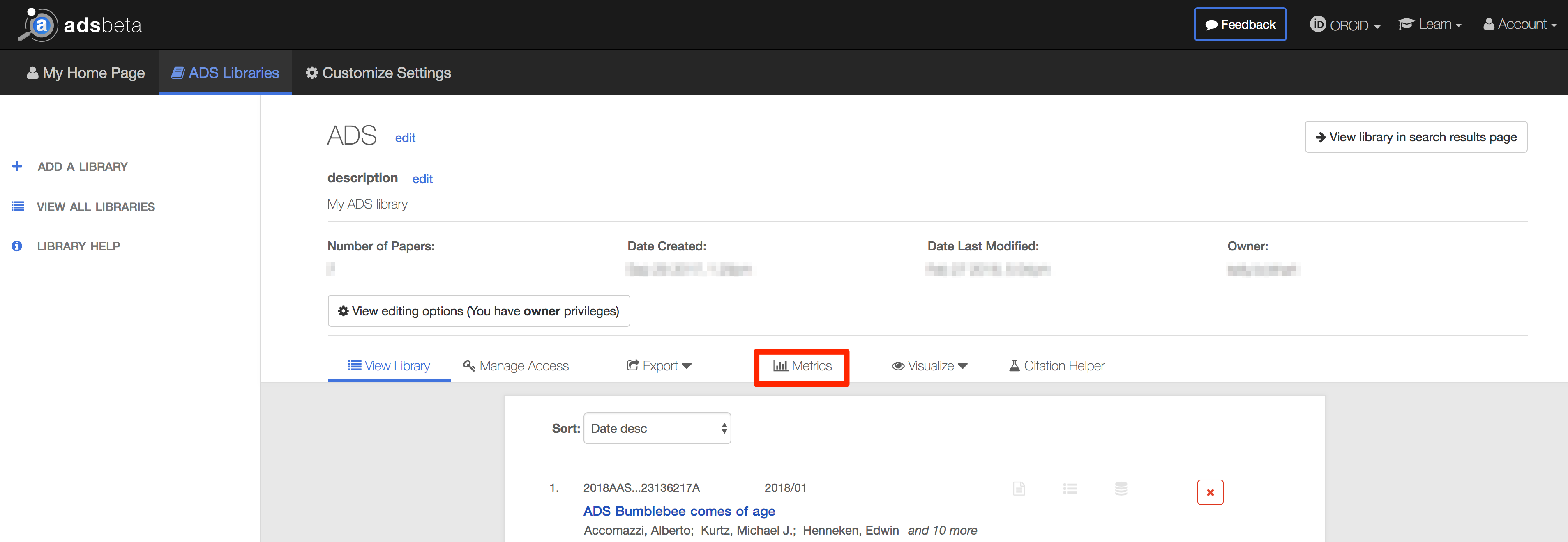 The citations and read statistics for a library are available, similar to those available from the search results page or an abstract page. Click on the Metrics button within the library to view.