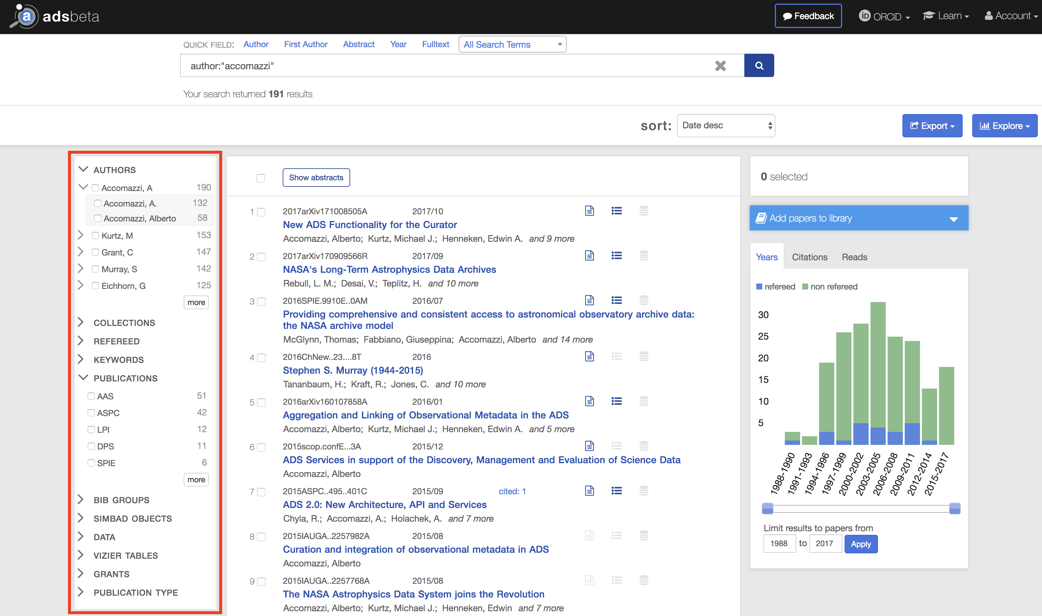 If your search by author and/or publication year returns too many results, you can use interactive filtering to narrow down the results instead of editing your original search query. Filtering by author or publication is often useful when a paper is known.